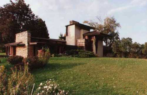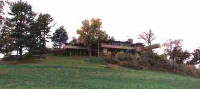 | タリアセン ウィスコンシン州スプリンググリーン 1911 建物は丘の上に置かれているのではなく、木や岩のように丘の一部になっている。 |