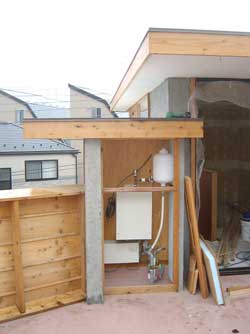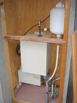 灯油焚きボイラーに比べコンパクト。 3Fからメイン配管(各階への配管長を同じにするよう、湯は一度1階に送られてから2,3階に戻る)を通して各階の床配管を循環します。 床配管に到達する以前に熱を失わないよう装置や温水経路を十分に断熱することが重要です。 |