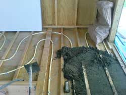 2、3階床の床暖房配管にはフローリングの下に落し込みの床を設け、モルタルを打設して蓄熱と熱の伝達をさせています。 |