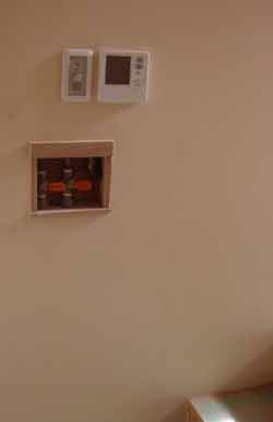 階段室の壁に取り付けられた床暖房のコントローラー類 右上は、エコヌクールピコの熱源機リモコン(タイマーと水温設定用) 左上は、床温度センサーによるサーモスタット(床温度コントローラ)。床暖房は家の中の代表的な一ケ所の床の温度によりON-OFFされます。 下は、1階床暖房温水回路のバルブ。各部屋への温水配管は手動で開閉します。 |
