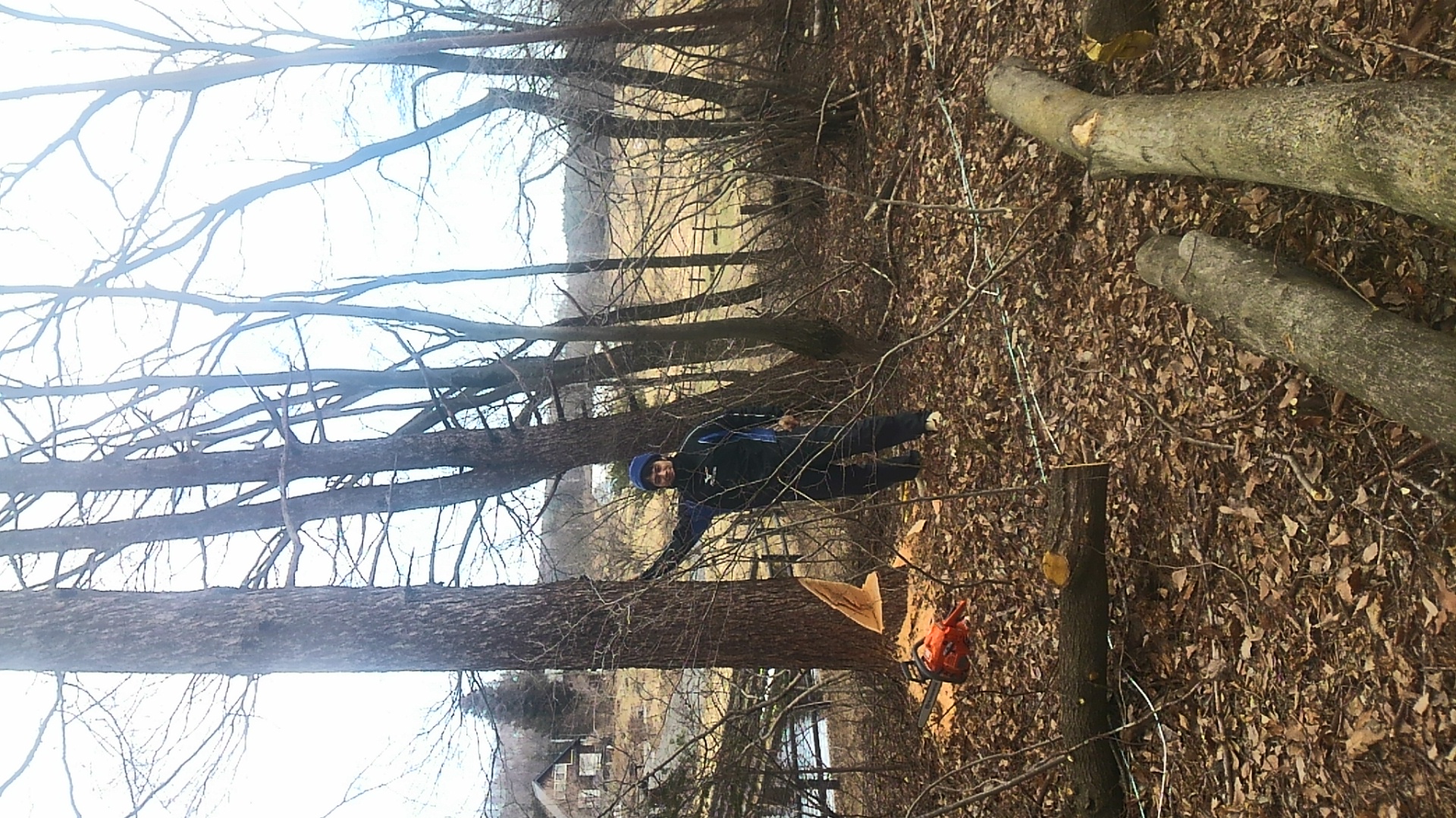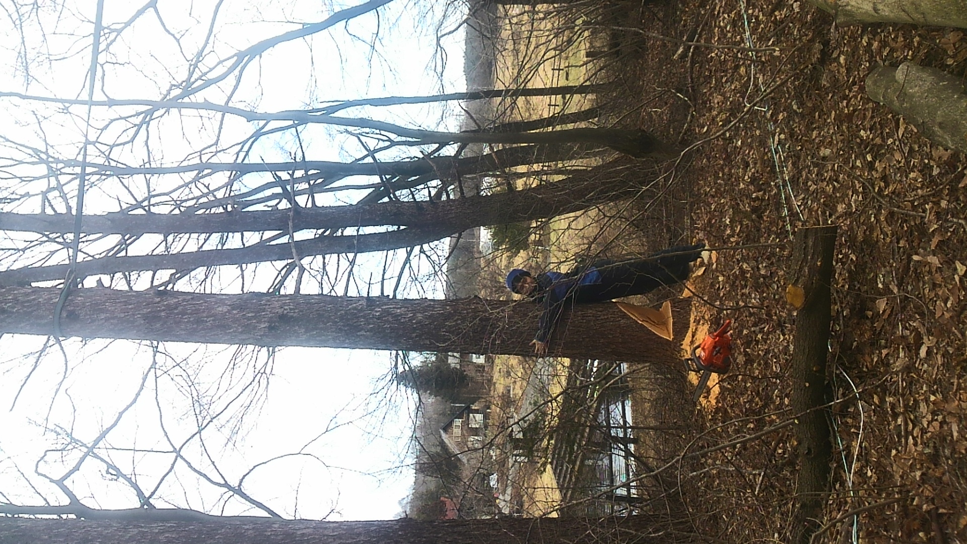 敷地いっぱいになるため、隣家に当たらないよう木の高さを見上げ角度から測った。他の立ち木の枝かかりにならないよう、敷地から出すのに困らないよう倒す方向と順番をよく考えて倒し始めた。