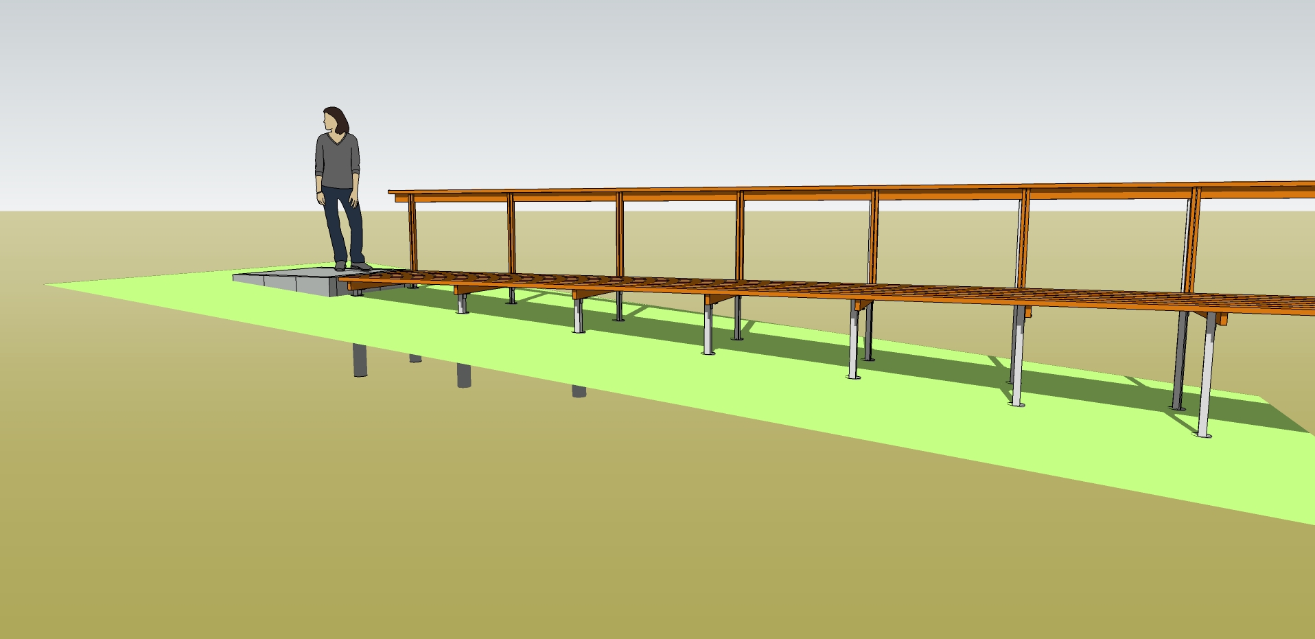 まず、亜鉛どぶ付けのアングルを建てて支柱にする。:L50x50x6、(支点間1200mmは2x6デッキ材の限界。これ以上はたわみが気になってくるだろう。) 野村さんと協働で。