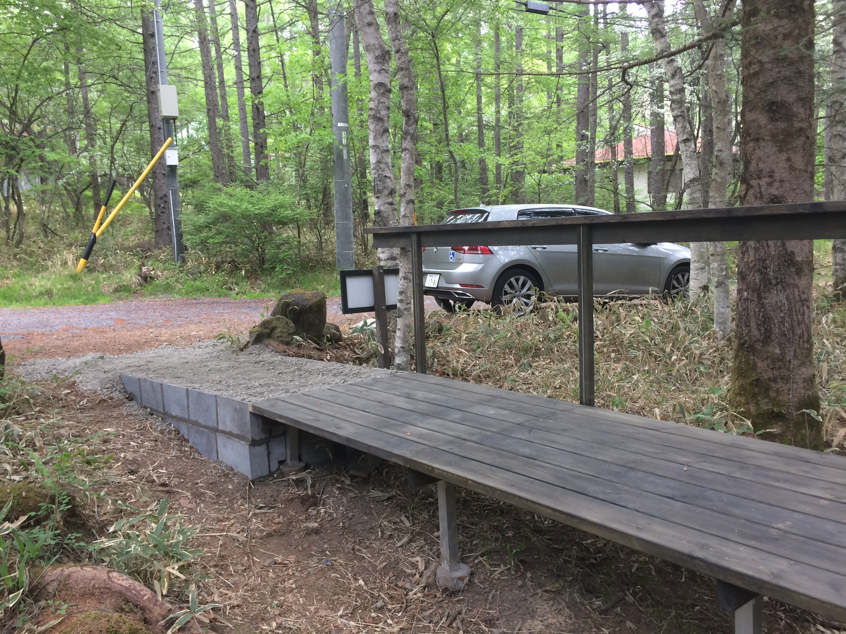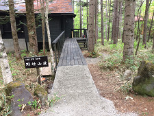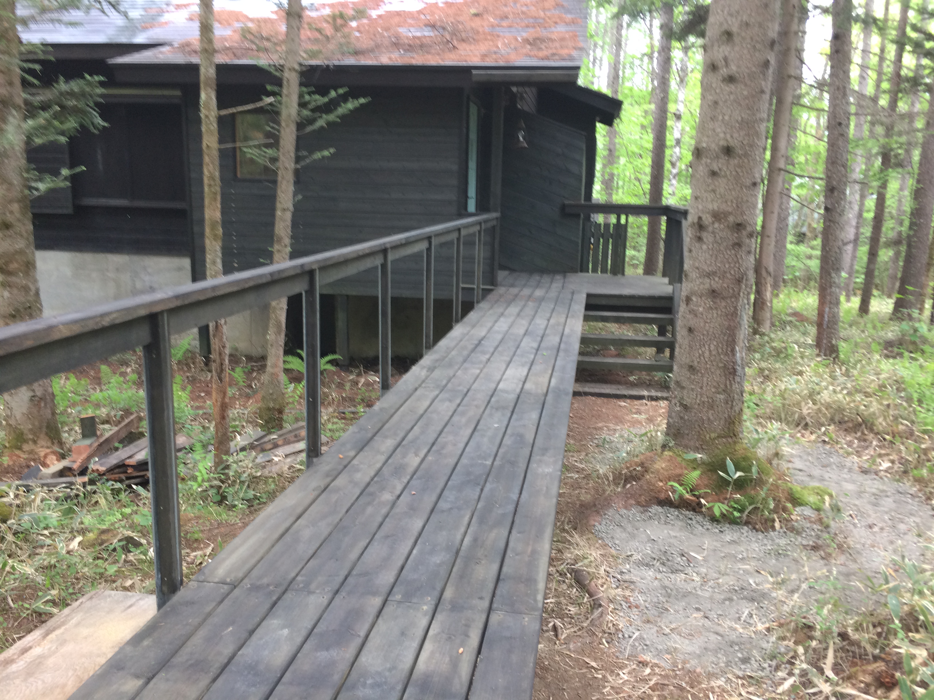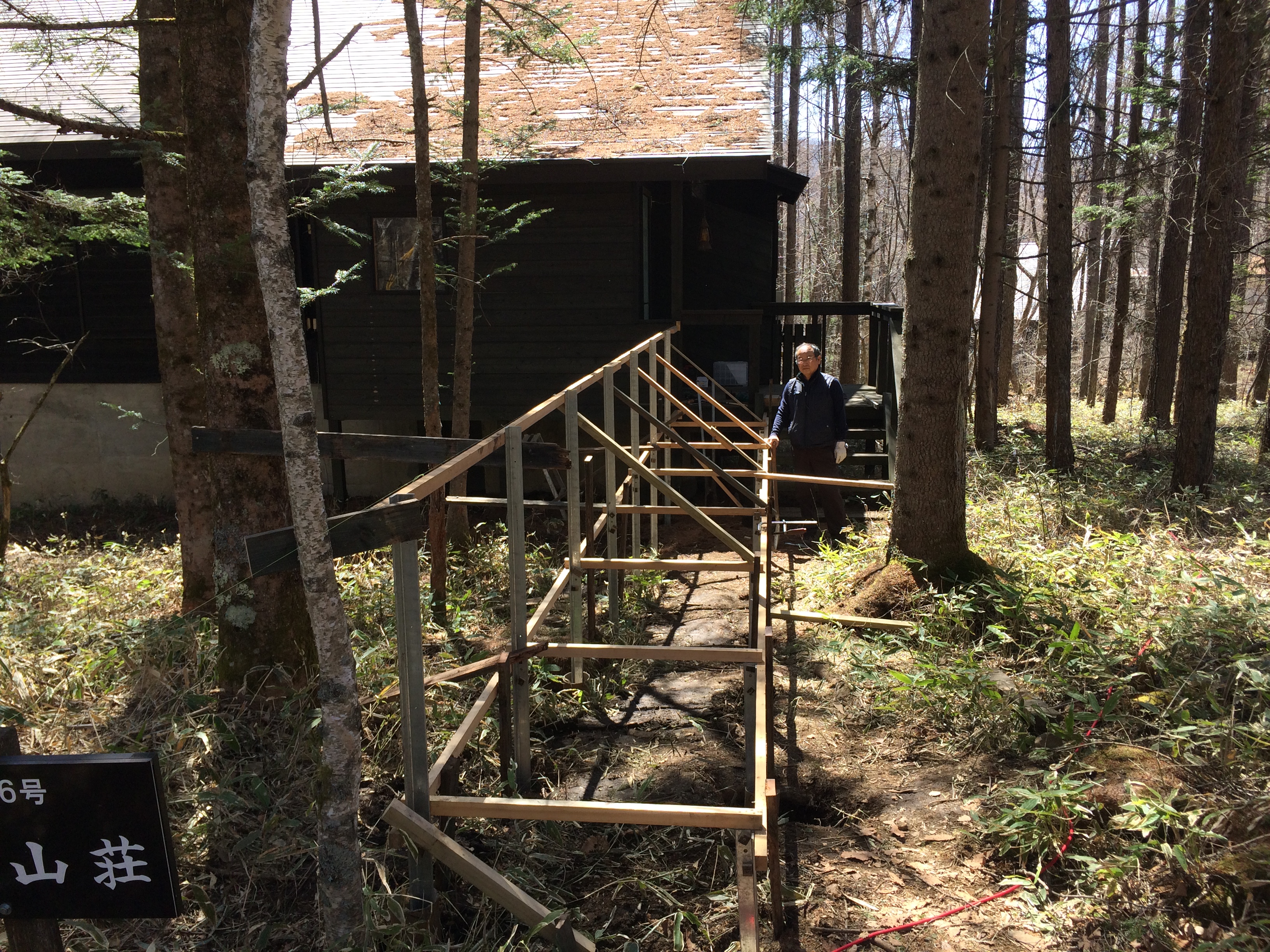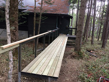 お世話になっている野村さんの蓼科の山荘。デッキの修理に続き、90台のお母さんが道から玄関ポーチまで平らに入っていけるよう橋を作った。 |
