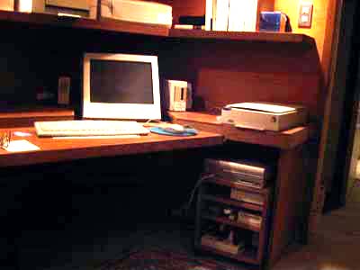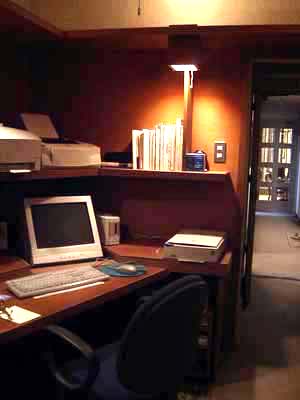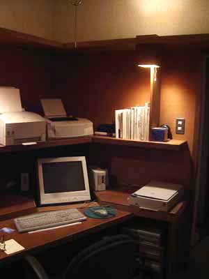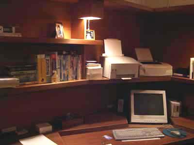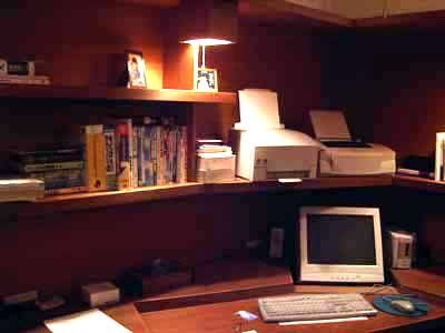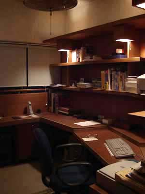 | 石神井の書斎 (マンションの改装) パソコンを趣味とする主人のためのマンションの一室を改造したパソコンルームの例です。 ディスプレイは低い位置で傾斜させると眼が乾きにくく疲れが少なくてすみます。液晶のディスプレイが出てきて大分改善されましたが、液晶のディスプレイも低い位置に埋め込んで大きく傾斜させるとうんと楽になります。 キーボードやマウスの高さも普通の机より低い位置にすると楽です。 最近つくる書斎では、パソコンが必須アイテムになってきていますが、このようなパソコンの人間工学の知識を応用した書斎にすることが多いです。今後、家で仕事をする人たちのホームオフィスはますます増えてくると思いますが長時間パソコンで仕事する人たちにとってこのことは重要と思います。 |