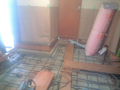 逆梁の配筋に継ぐように床スラブの配筋をし、床暖房の床配管をする。 |