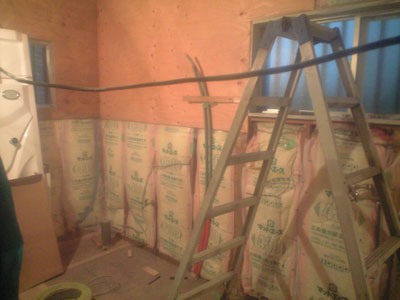 断熱材を入れ防湿ビニールを壁の室内側に張る。 外壁の内側に構造合板を100mm間隔に打った2x4用のCN50釘で取り付け、耐力壁にする。 |