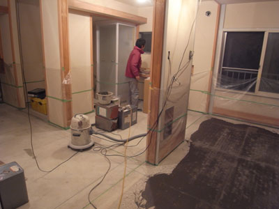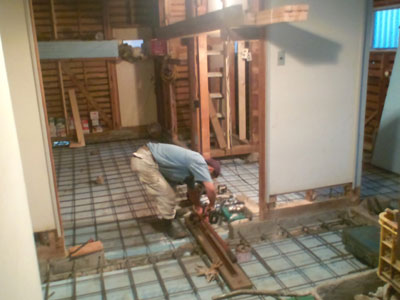 逆梁の上にコンクリートを打って120mm厚の床スラブを作り1200おきに目地を切る。新しい床の高さは既存の軸組の土台下端になる。 |