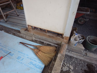 既存の無筋の布基礎の両側に300mm巾の溝を掘りスタイロフォームを用いて逆梁の型枠を建てる。梯子型の配筋を入れてコンクリートを打ち新しい逆梁の基礎を作る。 耐力壁の柱はホールダウン金物で新しく作った逆梁に緊結される。 |