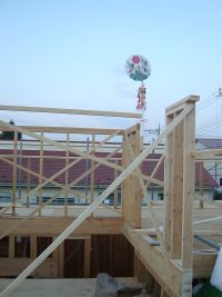 屋上階の屋根はまだ出来ていませんが、フレーミングがほぼ完成ということで上棟式を行いました。