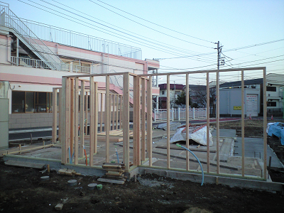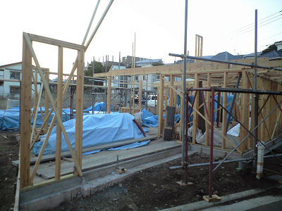 この後3/11地震が起こった。道路が波打ち自分のトラックと近くの送電線の鉄塔が踊りまわる。現場は2階の床フレーミングが始まる直前で2階床フレーミングの下ごしらえをしている段階だった。 |
