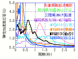 発生した地震動の性質 2011年東北地方太平洋沖地震で発生した地震動と被害調査速報より(境有紀氏)(04/14 updated) 今回の地震の周期が短かった理由について ----- プレート(板状の岩盤)内部で起きる地震は短周期の地震波が強く出るといわれる。 プレート内の深い地震 短周期の地震波が強く出る 震源がプレート間 長周期の地震波が強く出る