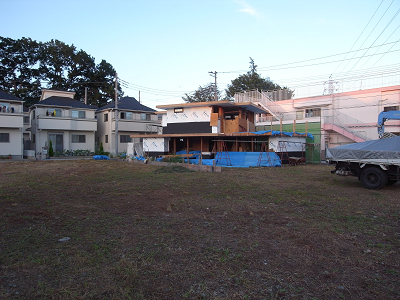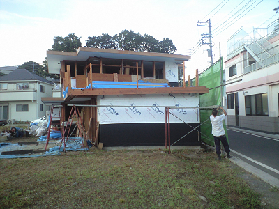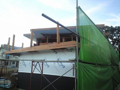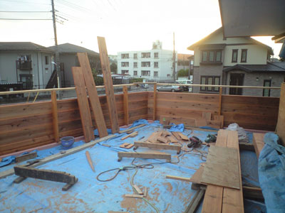 杉赤身材製のパラペットを張り始めた。今週末は台風がやってきそう。