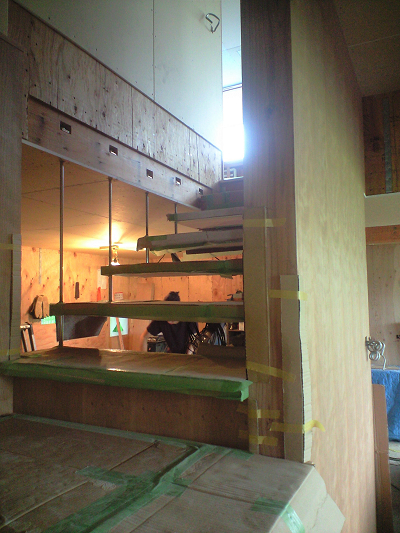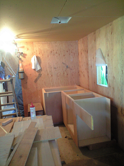 伊豆作業所で製作してきたキッチンキャビネットを搬入して取り付ける。キャビネット類も今回はチェリー合板を用いる。