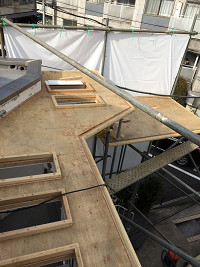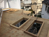 野地板を張り、スカイライトの立ち上がりを取り付ける |