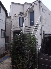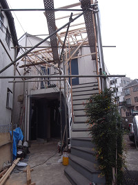 庇を取り付ける前。 変形土地に合わせて作られている6戸のアパート、心ある人が作ったものだと思う。 この建物に合うものを考える。 |