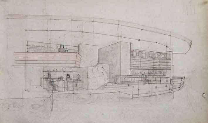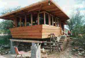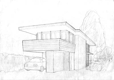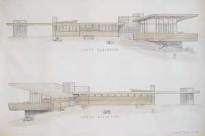 | シェルター この小さな建物はアリゾナのタリアセンウェストの砂漠の中で、ライトのユソニアンハウスのスタンダードディテールを用いて、建具に至るまで実際に筆者により建てられました。