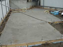 コンクリ打ち、スラブ完成 この後1.2m間隔の碁盤の目に目地を切り、スラブ表面から急速に水分を失わないよう養生します。 |