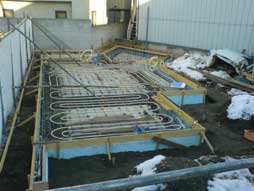 床暖房配管 ポリブテンパイプの床暖房配管をコンクリートスラブの床に埋め込みます。 ポリブテンは最も長い寿命が期待できるプラスチック材料です。 今年は例年になく雪が多く降りました。現場にも雪が残っています。 |
