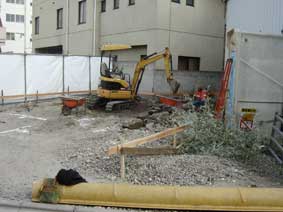 2006.12/23 地中梁の部分を掘り終った後、スラブオングレードの側面の型枠を2x6材で組みます。スラブ下になる設備配管も終わらせてあります。 |