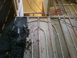 3/27 2、3階の床暖房配管を始めました。 配管はフローリングの下の根太間の落とし込みの床に固定されます。 |