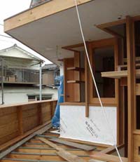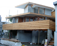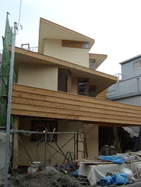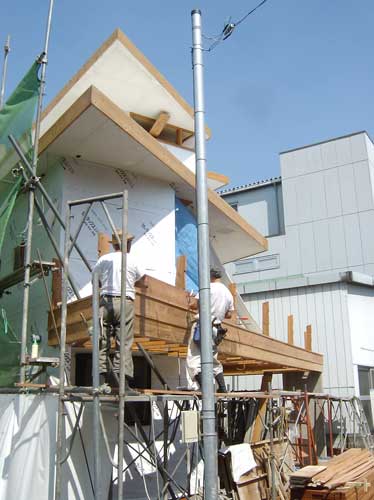 7/26 杉赤身材によるパラペット。 露天での木材の使用には赤身材と,良く考えられた詳細の設計が必須です。 準防火地域でもテラスすのことパラペットの木材使用が可能です。 建築基準法の改正により、準防火地域での木製の屋根鼻隠しも可能になっています。 |